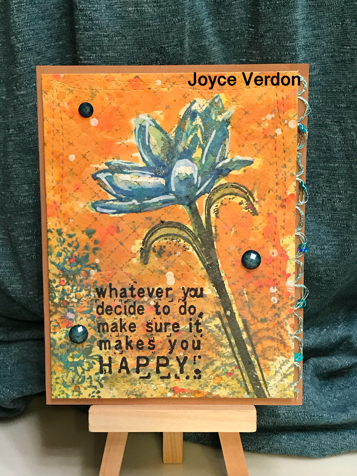 At this point, I decided I wanted more of a contrast around the flower and added a messy wash of orange. I probably could have skipped this step, but I didn’t! So, it is what it is! I stamped the sentiment, added blue ribbon on the side, dark enamel blue dots and mounted it all on Kraft cardstock. As usual, I am experimenting on creating interesting, supportive background paper that complements the edginess of the mixed media type images. I think this turned out okay, but Ned to continue practicing this style (I love doing this freestyle stuff...good story and I’m sticking to it!)
