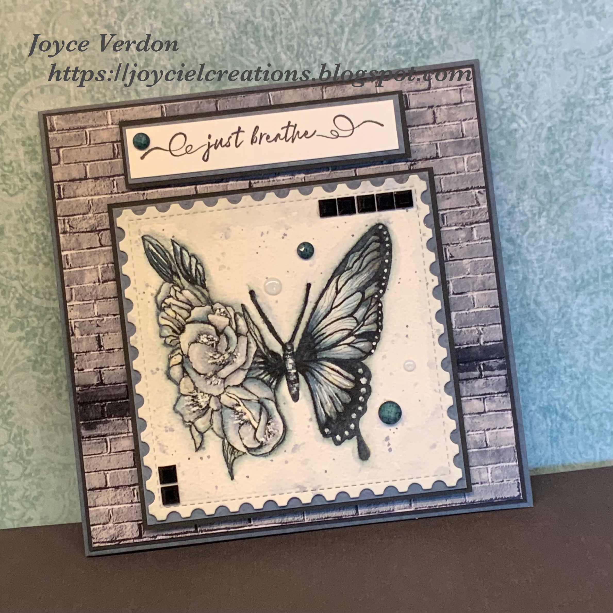 This next card was also inspired by the Stamperia paper which you can see in the background of the photo. I used Jeanie Hays’ Unity Sail With No Limits kit and for the sentiment, Fresh Air and Sunshine from July 2022. I used my watercolors and watercolor paper after stamping the image with Antique Linen. I added pen marks to tighten up lines and inked the sentiment on when done. This time, I embellished the card with twine, metal embellishments and sequins.